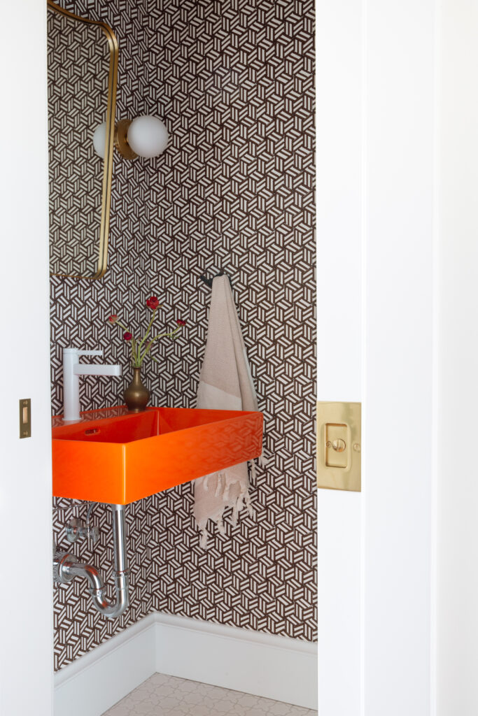 This narrow powder room, carved out of a former bedroom, was designed as a playful surprise. A bold geometric wallpaper wraps the space for instant impact, while the bright orange wall-mounted sink and matte white faucet add a punch of color and contrast. The result is a compact room that feels energetic, unexpected, and full of personality.