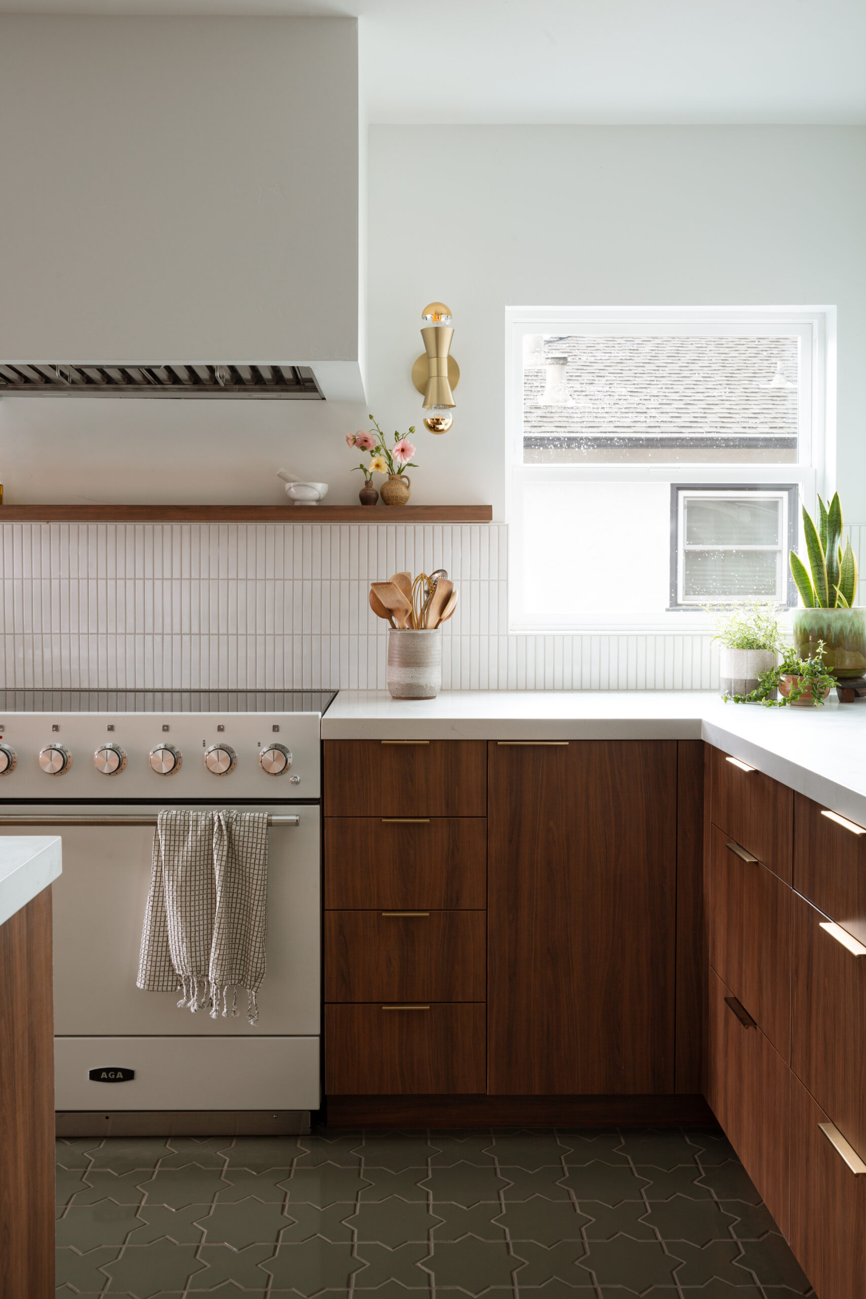 In this kitchen redesign, we aimed for a blend of modern style with vintage inspiration that respects the home’s original era but increased storage and functionality. Although the space was narrow, we opened it up and enhanced natural light by removing the wall between the kitchen and laundry room. We maximized the space by the back door by narrowing the cabinet depth, which allowed for additional storage while maintaining functionality. By blending open shelving with closed cabinetry, we achieved a balance between practical storage and an airy, open feel in a small space.
